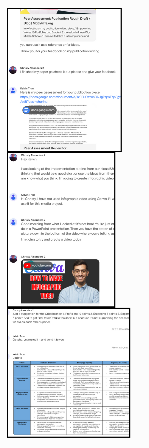 In EDLD 5317, Christy and I collaborated closely on Groupme developing a publication rough draft rubric to ensure that our article remained meaningful and cohesive. We shared feedback on each other's papers, leveraging insights to revise and refine our publication article collaboratively. This collaborative process not only enhanced our individual learning experiences but also contributed to the overall quality of our work. Moreover, in this course, I explored various media options to amplify my innovation plan, taking it to another level. By utilizing different media platforms and tools, I was able to effectively communicate and showcase my innovation plan to a wider audience, enhancing its visibility and impact.